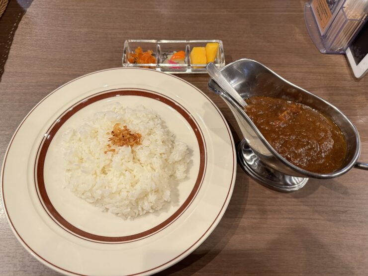 付け合わせには、福神漬けに野菜のピクルス、そしてマンゴーが提供される。ご飯の上にはフライドオニオンが添えられており、カレーと一緒に香ばしい味わいのアクセントもつけることができる。