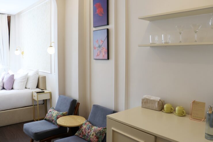お部屋はベトナム人アーティストSi Nai Truongのアートワークで飾られています。通りを見渡せるバルコニーがあり、日中は窓から明るい光が差し込んでいました。