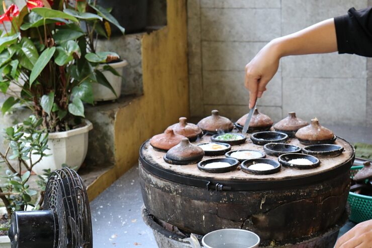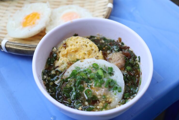 朝食には、ダラット名物「バインカン(Bánh Căn)」をぜひ食べてみてください。米粉の生地をウズラの卵・ひき肉・エビなどの具材と一緒に専用の型で蒸し焼きにしたものを、甘酸っぱいスープにつけていただきます。ホテルの周りにはバインカンを食べられる食堂がたくさんありました。