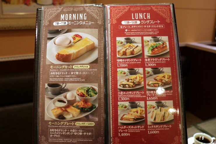 ドリンクは、コーヒー各種のほか、紅茶、ココア、ミルク、ジュースなど、豊富なラインアップ。名古屋の喫茶店らしく、モーニングの時間帯(7:00~11:00)は、ドリンク代のみで「ゆで卵」と「トースト(ハーフ)(小倉/バター/ジャム)」がついてきます。