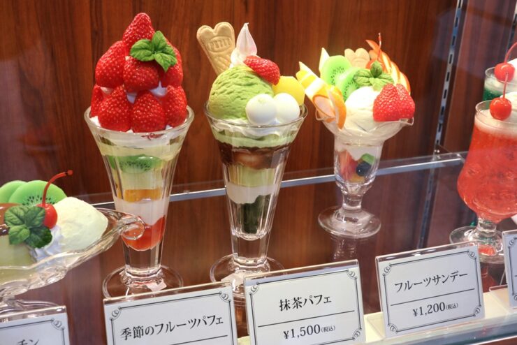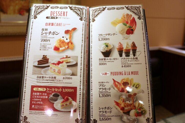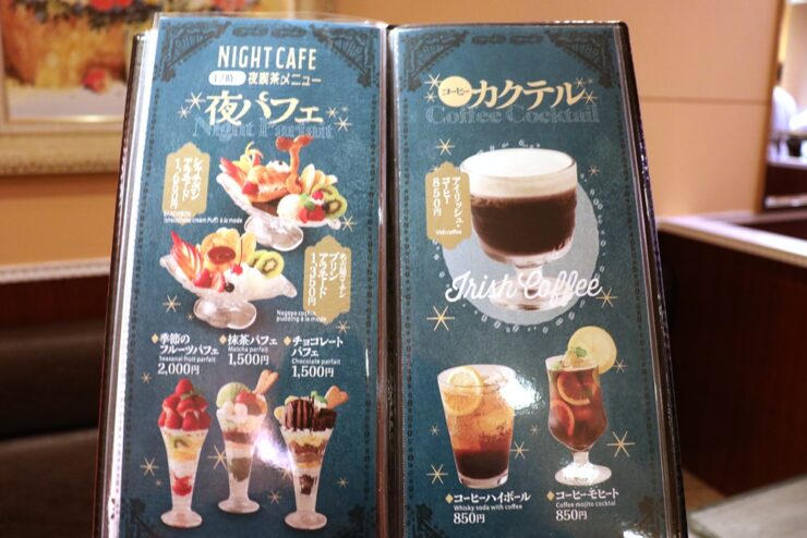17時からの夜喫茶メニューには、季節のフルーツパフェ、抹茶パフェ、チョコレートパフェなどが登場。先ほどのシャチボンアラモードは夜の時間帯にも注文できます。