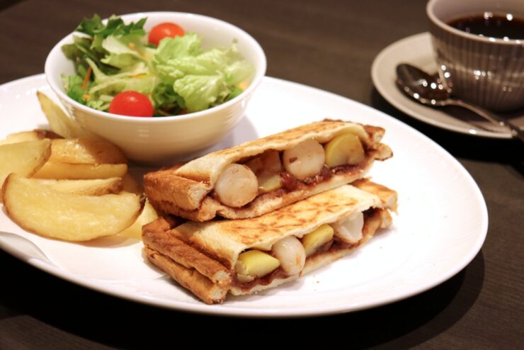 小倉ホットサンド(上写真はランチプレート)は、名古屋喫茶の定番“小倉トースト”を、ボン・ヴォヤージュ流に贅沢アレンジしたもので、濃厚な小倉あんに、もちもちの白玉とホクホク食感の栗が入っています。小倉あんの甘さが、ストロングブレンドのコーヒーによく合います。
