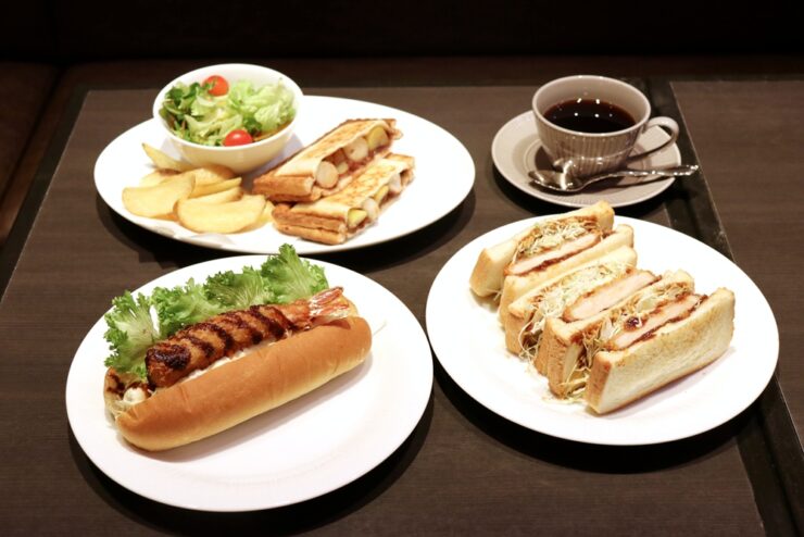 ランチタイム(11:00~14:00)のおすすめは、エビフライドッグや味噌カツサンドなど、名古屋の味覚を存分に楽しめるご当地サンドに、ポテトフライとサラダ、ドリンクがセットになったお得なランチプレートです。旅や出張の合間に名古屋らしいものを食べたいときにぴったりです。