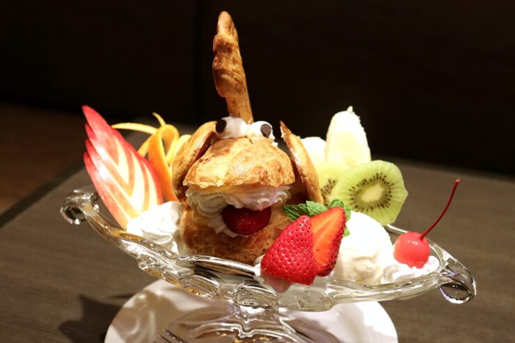 そのシャチボンを贅沢に使ったメニューが「シャチボンアラモード」。たっぷりのフルーツ、濃厚ブラウニー、バニラアイスの上にシャチボンを載せた、見た目も味わいも特別な一品です。船のような形のガラスの器も“ニューノスタルジー”を感じます。
