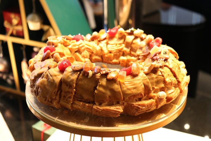 「クリスマスツリー・パリブレスト」は、リング状のシュー生地に、プラリネ風味のクリームをたっぷりと挟んだ、フランスの伝統菓子。クリスマスリースをイメージして、華やかに仕立てられています。しっとりとしたシュー生地が、ナッティーな香ばしさとこっくりとしたキャラメル感のあるクリームによく合っていました。