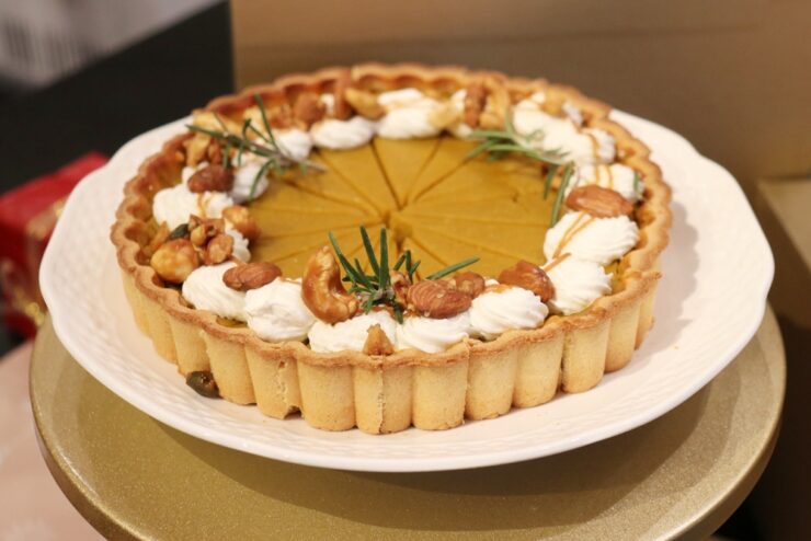 「パンプキンタルトリース」は、シナモンが香るなめらかな舌触りのかぼちゃフィリングを詰めたパンプキンタルト。同じタルトでも、クリスマスフルーツタルトとは形状も食感も大きく異なり、こちらはかぼちゃフィリングを存分に味わえます。スイーツのラインナップが似た感じにならず、一つひとつ個性が際立っているのがヒルトン名古屋のスイーツビュッフェらしいと感じました。