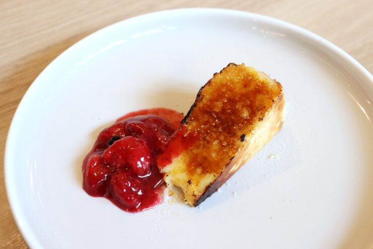 同じくライブステーションで提供される「炙りバスクチーズケーキ ミックスベリークーリー添え」は、提供直前にバーナーで炙ってくれるので風味が一層引き立ちます。香ばしく焼き上げた表面のパリパリとした食感と濃厚なクリームチーズのコクが際立つバスクチーズケーキに、爽やかな酸味のミックスベリークーリーを添え、余韻まで計算されたデザートです。ぜひできたてをどうぞ。