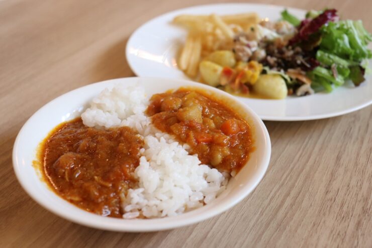 ヒルトン名古屋名物のカレーは本格的な味わいで、人気があります。この日はチキンマサラカレーとインディアンベジタブルカレーの2種類があったので、あいがけにしていただきました。