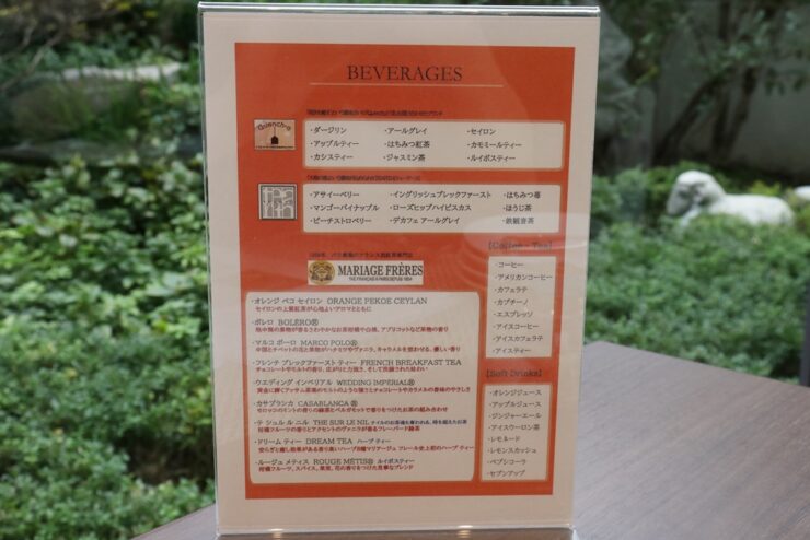 ドリンクは、マリアージュフレールのお茶を、スタンダードプランなら1杯、ティーセレクションプランなら飲み放題で楽しめます。両プランともに、そのほかの紅茶、コーヒーやソフトドリンクがおかわり自由です。