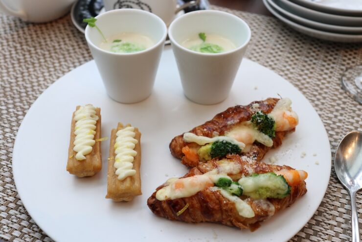 アフタヌーンティースタンドに盛り付けられたセイボリー3種に加え、3種のセイボリーが別添えで付いてくるのが、グラマシースイートならではの魅力です。別添えセイボリープレートの内容は、「季節のクロワッサンサンドイッチ~海老とブロッコリーのクリームグラタン~」「セロリラブのポタージュ」「プチチュロス 塩レモンクリームのディップを添えて」。
