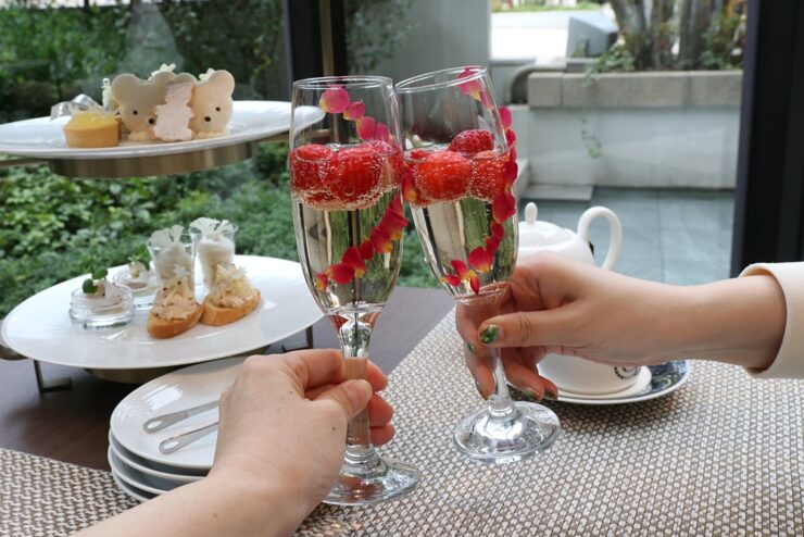 今回はスペシャルデザート+スペシャルドリンクのオプション付きプランを利用したので、最初にスペシャルドリンクが運ばれてきました。花びらでデコレーションされた特別なグラスで提供される「ベリー・メリー・スパーク」には苺が浮かんでおり、とても華やか。カチリとグラスを合わせた瞬間から、特別な時間が始まります。