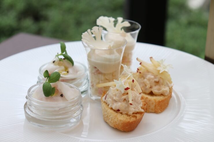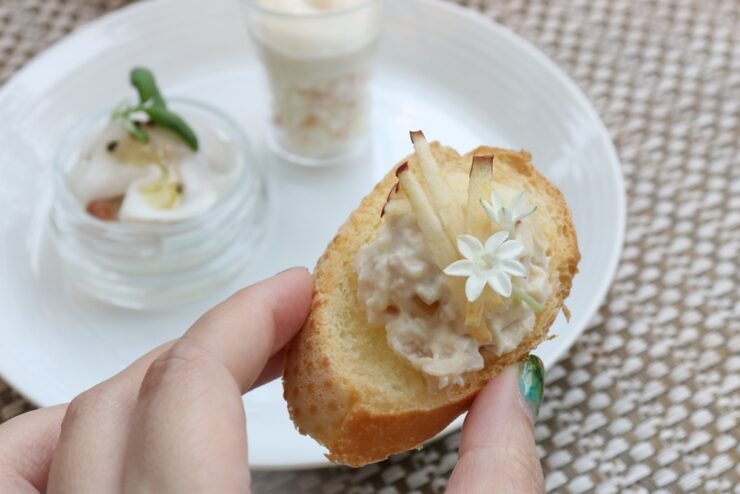 スタンド下段には、「カリフラワーのスノームース」「蕪と生ハムのカプレーゼ」「鶏胸肉と林檎のホワイトサラダ」の3種のセイボリーが載っています。カリフラワーのスノームースは、薄切りのカリフラワーが、まるで白いクリスマスツリーのよう。蕪と生ハムのカプレーゼは、しゃきっとした蕪と、しっとりやわらかな生ハムがお互いを引き立て合っていました。