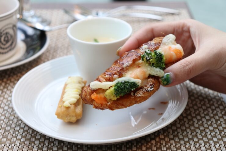 季節のクロワッサンサンドイッチは、サクサクしたクロワッサン、プリッと弾力のある海老、濃厚なクリームグラタンを一度に楽しめます。スタンド下段のものとあわせてセイボリーが6種類あるので、ボリュームたっぷりで、「甘いものばかりだと飽きちゃう」という方も心配いりません。