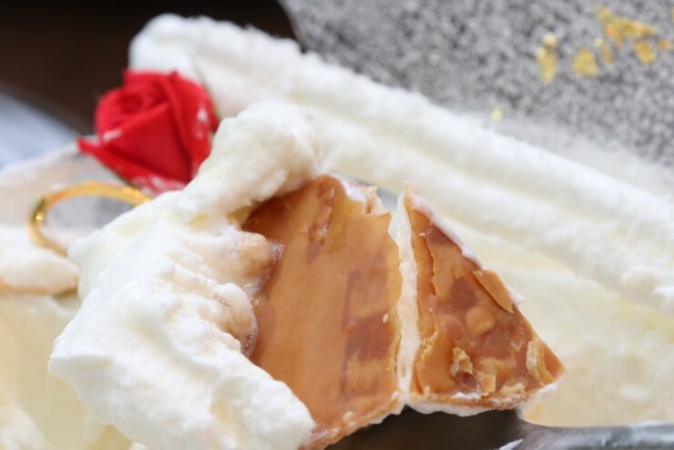 スプーンでキャラメリゼしたパイ生地を割っていただくと、ザクザク、とろーり、サクッ、もきゅもきゅ……と、いろいろな食感と味わいを楽しめます。ほどよいサイズ感ながら、最後の一口までおいしく食べられるように計算されたパフェなので、パフェ好きな方はオプションでスペシャルデザートを付けるのがおすすめです。