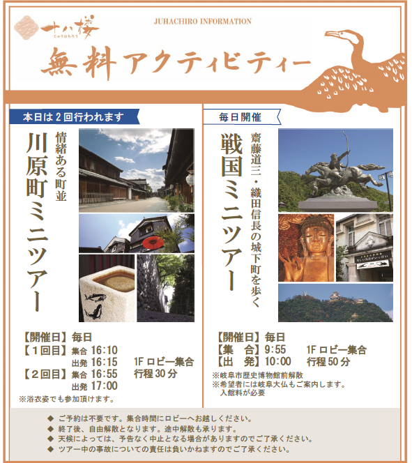 十八楼閣では、宿泊者向けの2つの周辺散策ツアー(川原町散策ミニツアー・戦国ミニツアー)を毎日開催しているので、岐阜の魅力をより深く知りたい方は参加してみては。(料金無料、予約不要、当日ロビーに集合) ご自身で周辺をまわりたい場合は、レンタサイクルも利用できます。