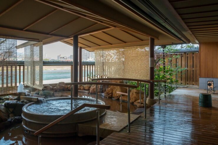 川の瀬には、鵜飼モチーフをデザインした露店風呂、薬草10種類(カミツレ、ジュウヤク、ガイヨウ、コウカ、チンビ、ダイウイキョウ、サンシシ、カンゾウ、マツブサ、モクツウ)をブレンドした薬草風呂、きめ細かいミクロの気泡を浴槽に発生させ、毛穴の中まで美しくするシルキーバス、寝湯を備えた内風呂のほか、明治時代の重厚な蔵を用いた「蔵の湯」が併設されています。