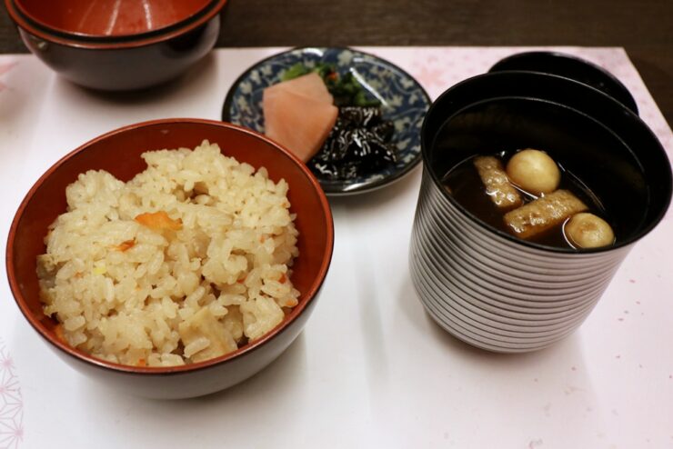 季節の炊き込み御飯と赤だし、香の物(飛騨・美濃伝統野菜 飛騨紅かぶの赤かぶ漬け、わさび昆布、高菜)をいただき、大満足で食事を終えました。