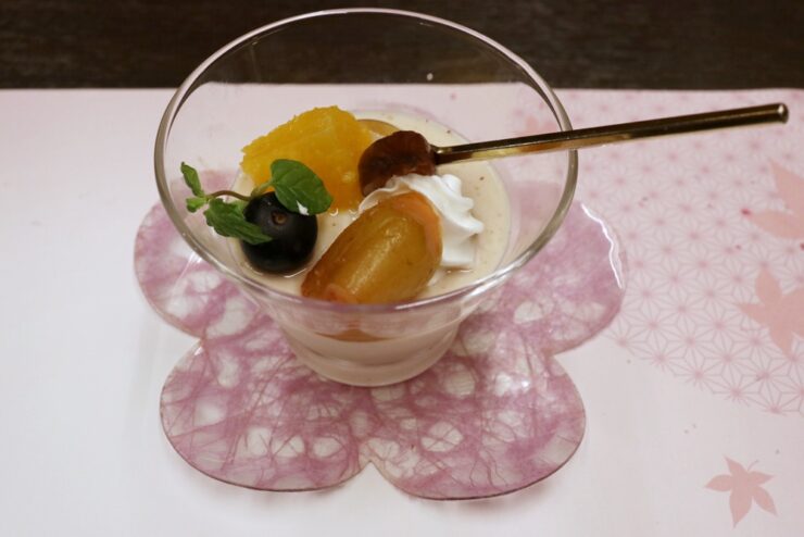 グラスデザートは無花果のコンポートをのせた栗のプリン。最後まで季節感を楽しめました。