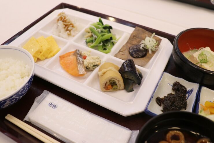 岐阜県産ハツシモの白ご飯と五穀米、長良川名物 鮎茶漬けといったご飯と赤だしに、朴葉味噌、豆乳豆腐、卵焼き、焼き鮭、サラダ、ソーセージ、ベーコンなど、さまざまなおかずから、好きなものを好きなだけいただけます。
