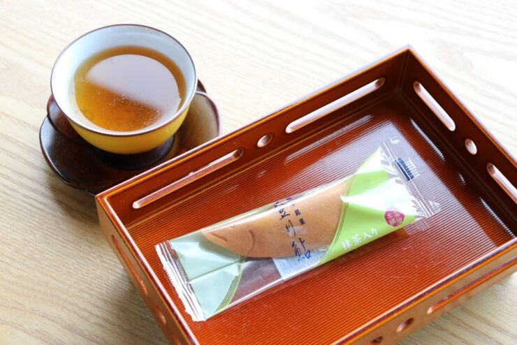 お部屋にはお茶と岐阜銘菓が用意されていました。お菓子は求肥に抹茶が練り込まれた玉井屋本舗の鮎菓子「登り鮎」。長良川を眺めつつ、鮎菓子をいただくのは風流ですね。